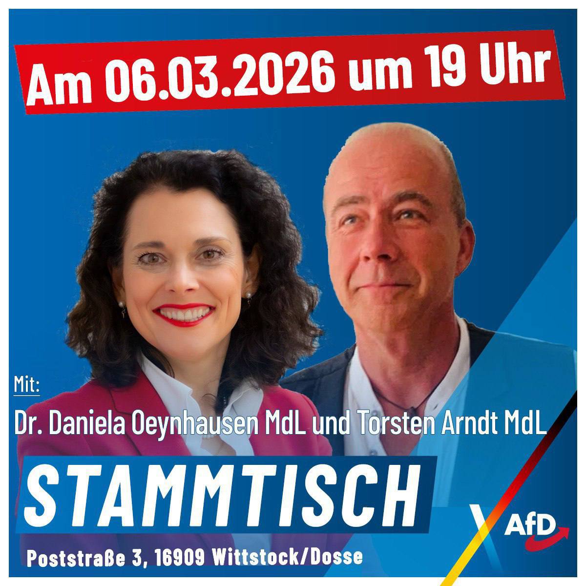 Als AfD Mitglied bin ich seit 2016 in der Basis-Arbeit im Ortsverband Birkenwerder aktiv. Im Landesverband engagiere ich mich sowohl im Fachausschuss für Familie und Demographie als auch im Fachausschuss für Gesundheit.